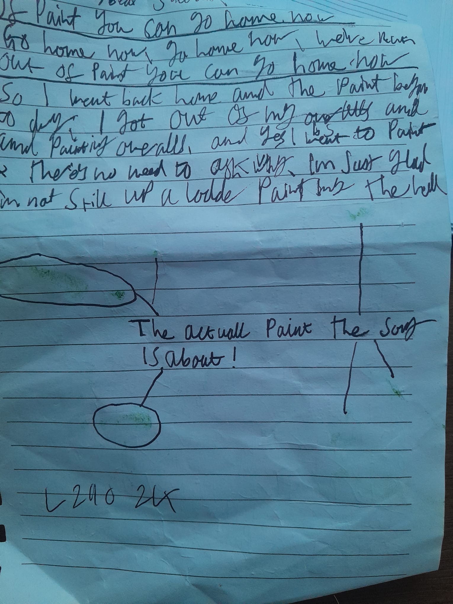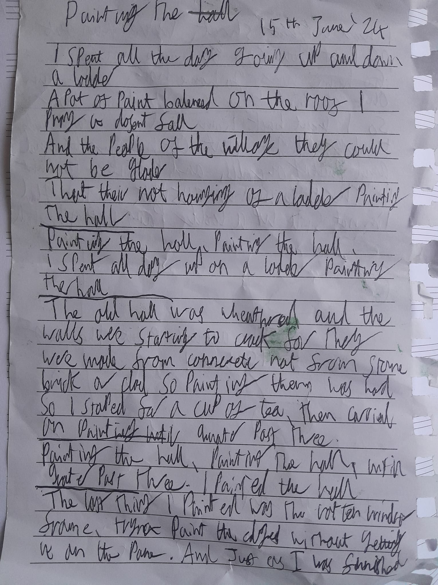 A group of local folk and I went one day to do some maintenance work on the local village hall, I was mostly painting the outside. While I was up a ladder painting, it got quite boring so I decided to write a song about it in my head. I've never written a song halfway up a ladder before! As soon as we were finnished at the hall I rushed for a piece of paper and a pen to write it down while I could still remember it. On that peice of paper there are green marks from paint that was still wet on my hands!