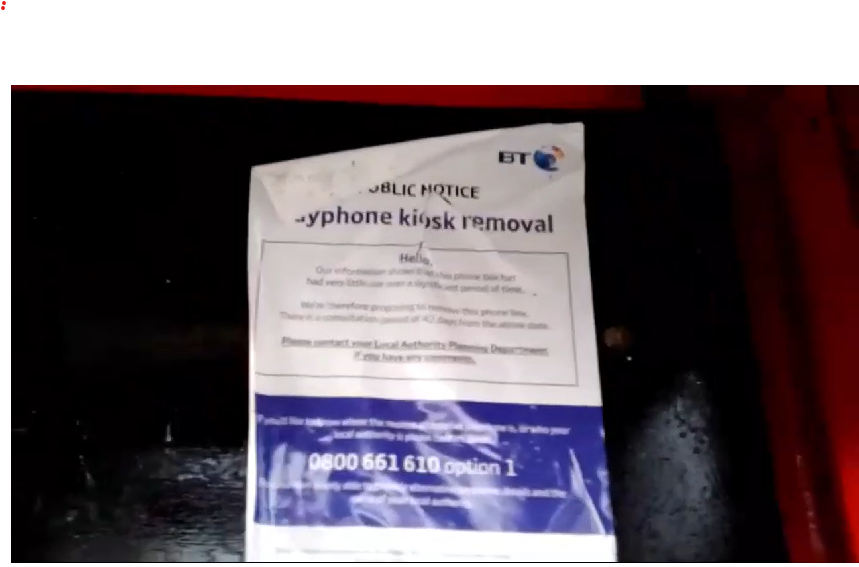 These images, which are screenshots taken from a video I shot in 2017, show a phonebox with a notice stating that the box was soon to be removed. Inside the phone itself was already gone. The box was removed shortly after these images were taken.